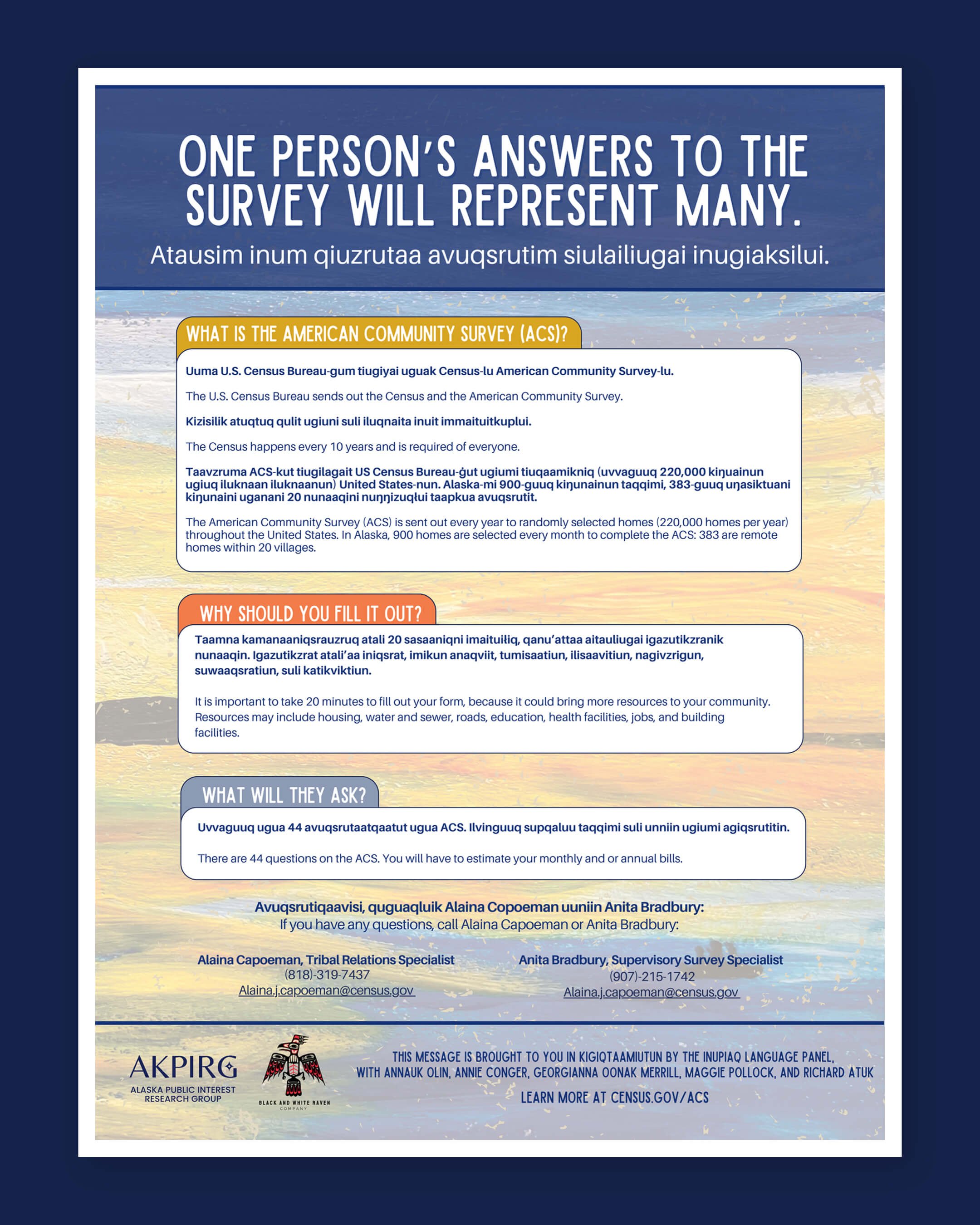 Check out the full toolkit with downloadable and printable resources in nine Alaska Native languages at akpirg.org/acs.