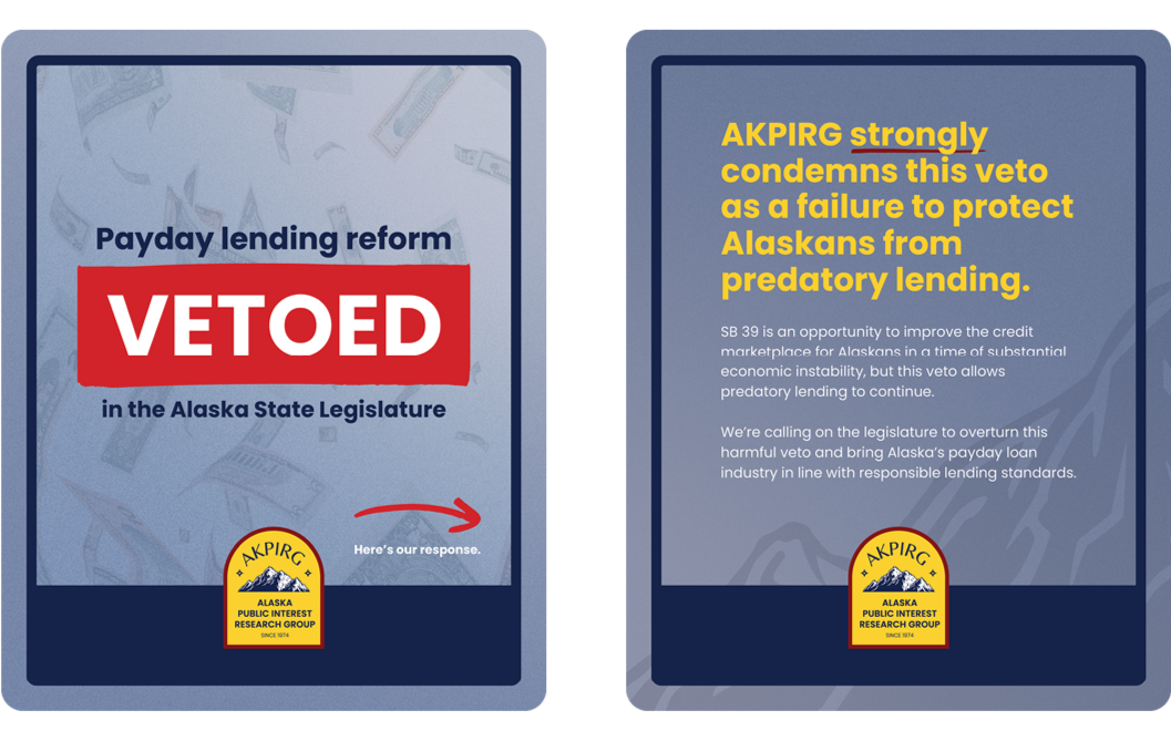 AKPIRG is calling on the Alaska Legislature to override this harmful veto and finally bring the payday loan industry in line with the responsible lending standards that Alaskans deserve.