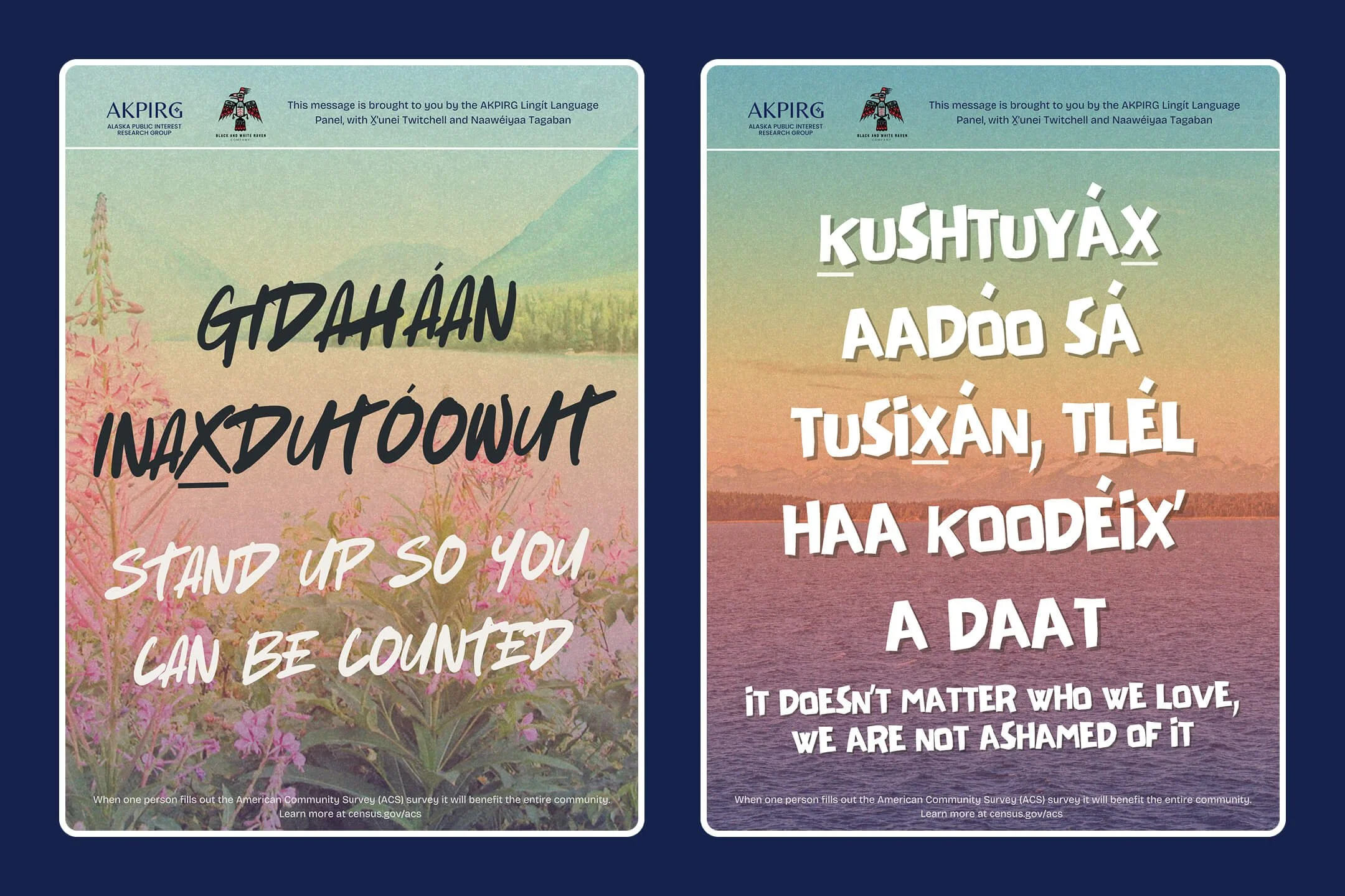 The ACS, conducted by the U.S. Census Bureau, helps determine how trillions of dollars in federal funding are distributed. When a community member responds, they create visibility for their whole community. These posters from our Lingít Language Panel highlight the importance of celebrating the identities and cultures that make our communities unique.